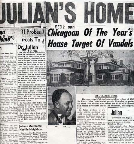 Percy Julian was named Chicagoan of the Year by the Chicago Sun-Times in 1950. That same year, Percy, Anna, and their two children were living in Maywood when they decided to move to Oak Park. There were no black residents in that suburb. They purchased a 15-room home that they were remodeling and landscaping when attempts were made to burn the house down. Someone broke in and poured gasoline all over, but the fuse did not light. The following summer, a dynamite bomb was thrown from a passing car, exploding in the flower beds in the front of the house. At the time, their children, ages 11 and 7, were at home with a caregiver and a security guard.
