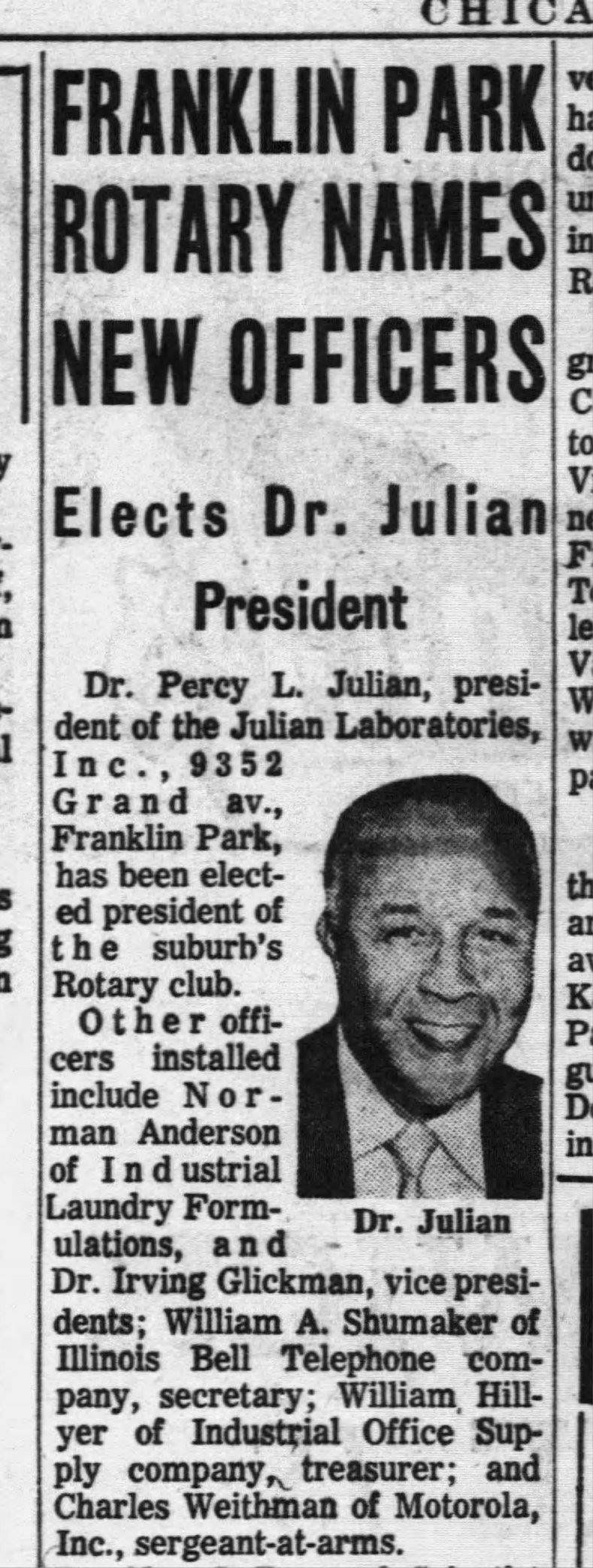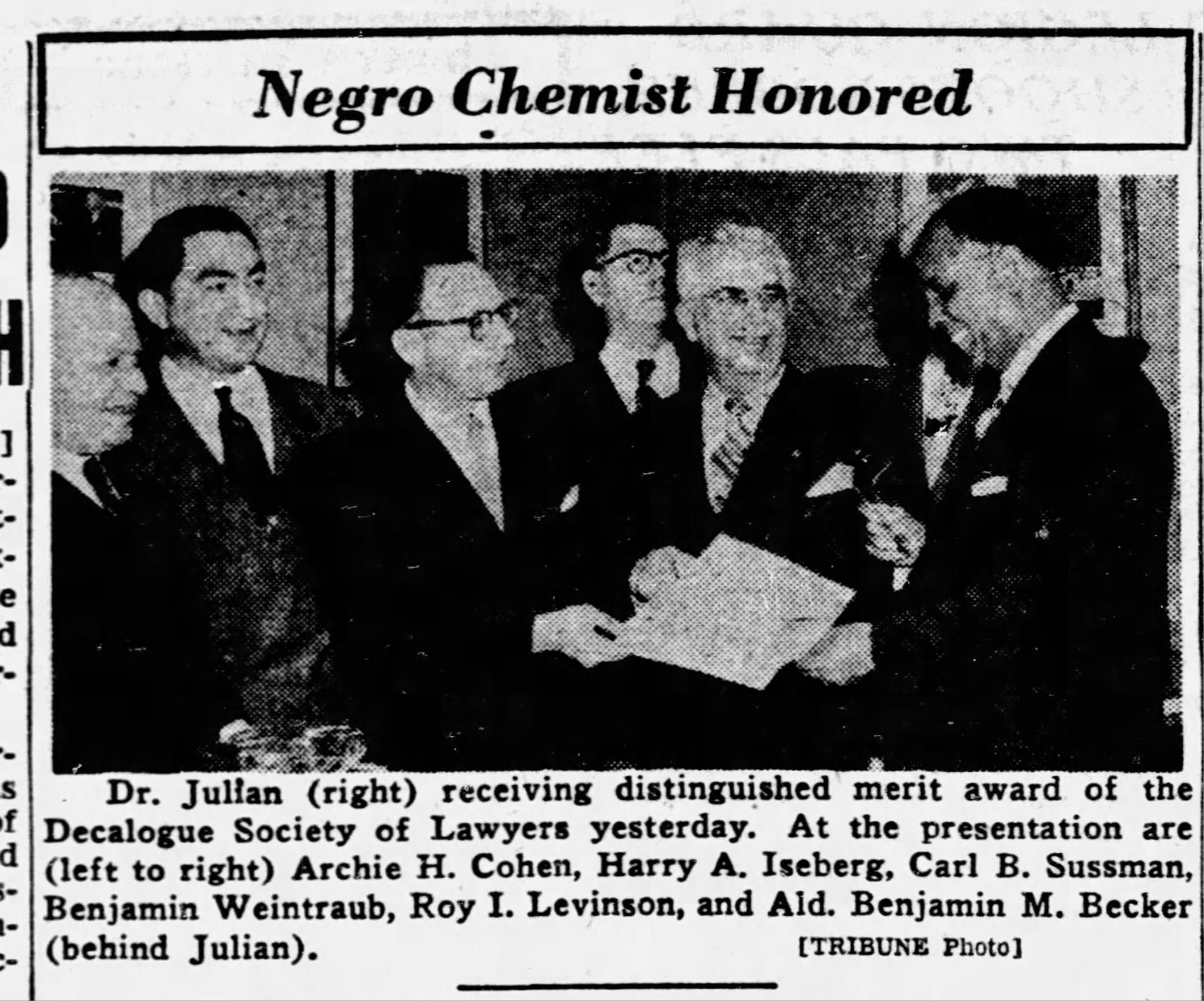 In 1953, Glidden got out of the steroid business, which, despite Julian’s innovations, was never profitable. Julian founded his own research firm, Julian Laboratories, Inc., in Franklin Park, Illinois. He continued to work on synthesizing hormones using Mexican and Guatemalan yams. Julian sold his company in 1961 to Smith Kline and Upjohn for $2.3 million.