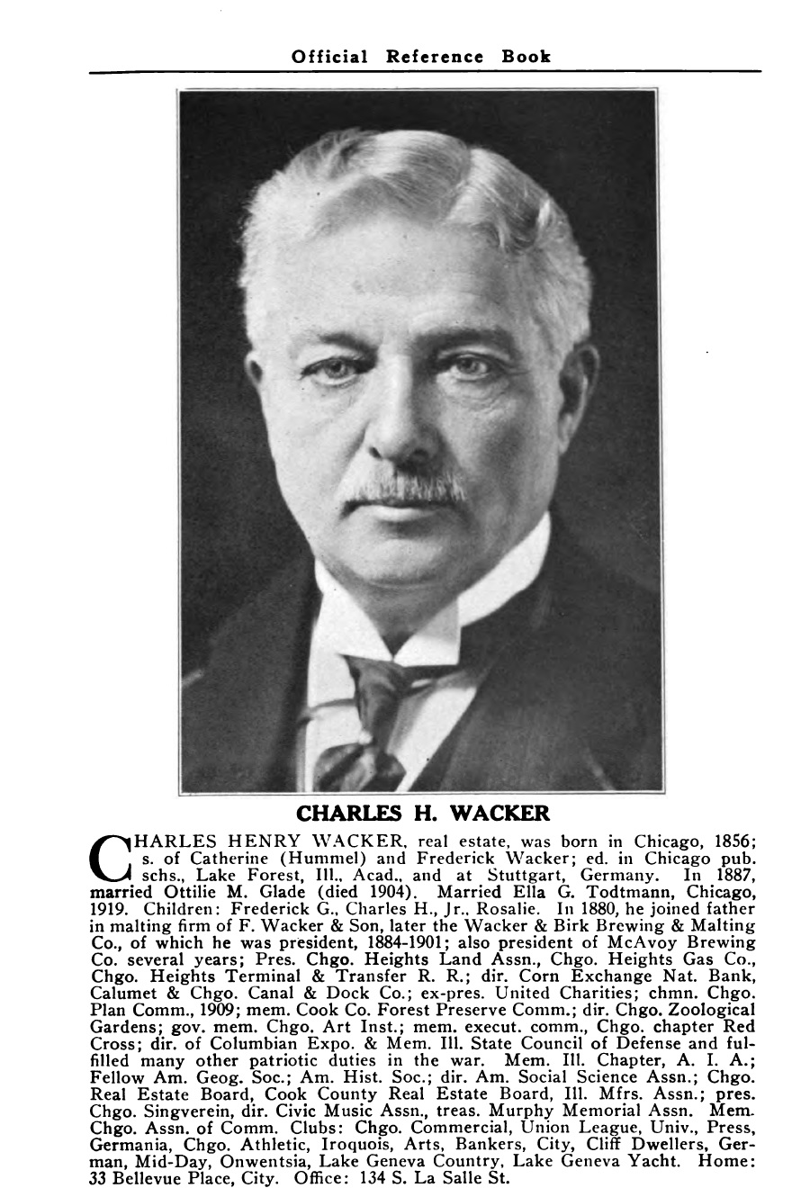 Charles Wacker is ultimately best remembered for his work as the Chairman of the Chicago Plan Commission, an appointed position he held from 1909 until 1926.