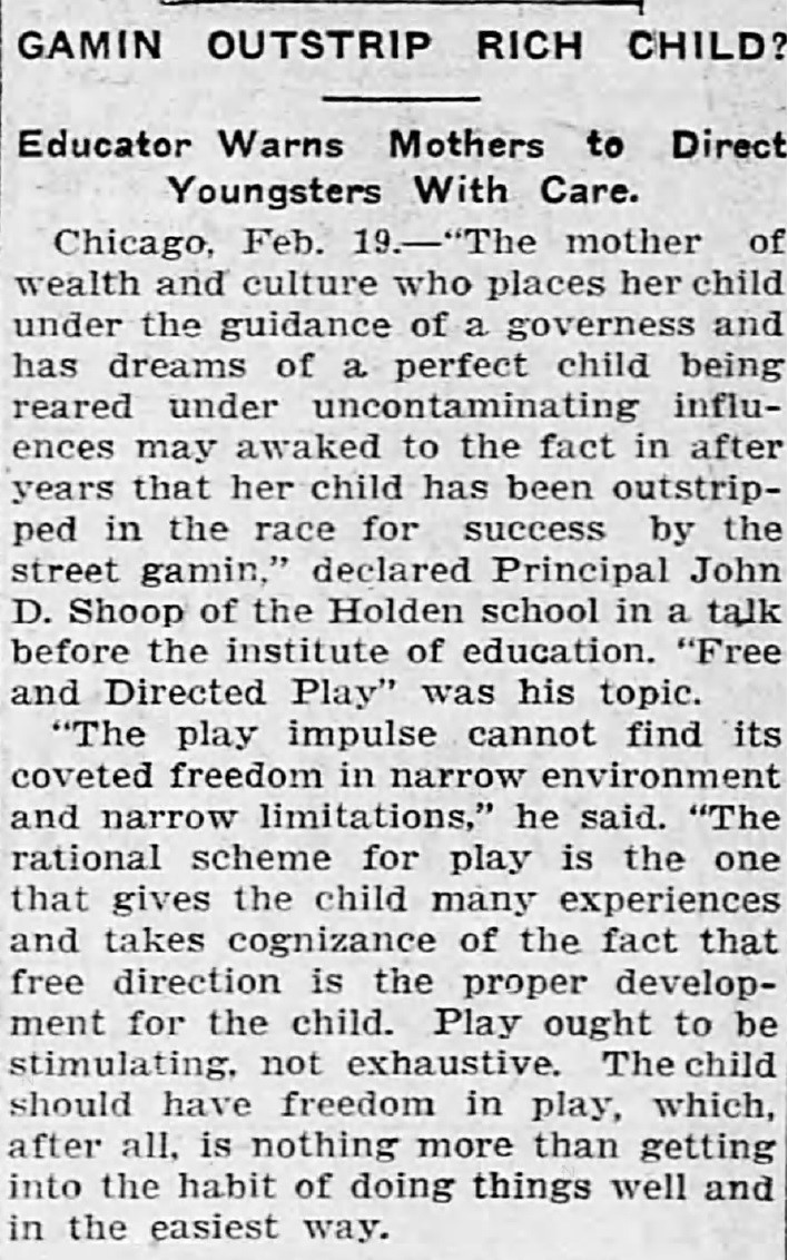 Shoop established himself quickly in Chicago. He had excellent public speaking skills and loved to recite poetry. He was a frequent and popular guest speaker, often quoted in the newspapers. Two examples of his views are attached to this post. He was made chief of “vacation schools” in 1908. These were summer programs, mainly for poorer inner-city children, designed to provide educational and recreational activities during the summer months.