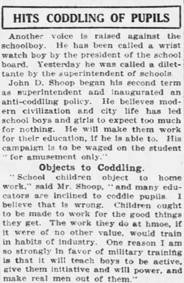 As Superintendent, Shoop dealt with many issues, but his term was largely dominated by World War I. He strongly supported establishing military training programs for boys in the schools. He had the “household science” teachers become certified in dietetics (nutrition therapy) by the Red Cross so they could teach the subject to high-school girls. He allocated funds to establish “victory gardens” at any school with a patch of land for the students to farm.