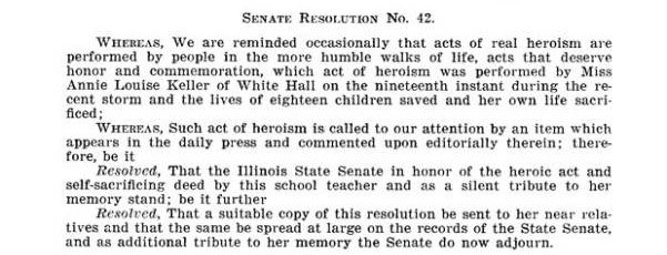 The Illinois State Senate passed a resolution paying honor to Annie’s heroism. A copy of that resolution is attached.
