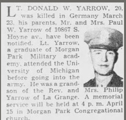 In October of 1945, Paul and Edna Yarrow received a bronze star medal awarded posthumously to Donald. The ceremony took place at MPMA. According to the Chicago Tribune, he won the medal for heroic action on February 23 of that year in Germany, a month before he was killed. In establishing an observation post, he and two comrades had to move through heavy enemy fire, and they captured sixteen German soldiers, four mortars, and ammunition.