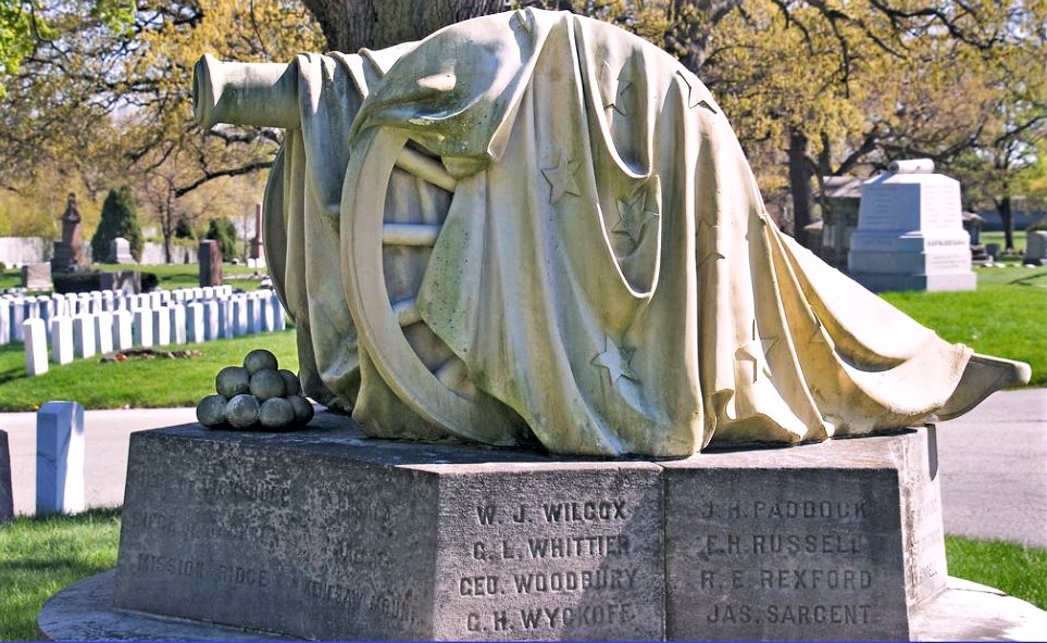 There is a monument to Battery A at Rosehill Cemetery on the north side. The names of those who died in service are inscribed in the base. W. J. Wilcox and R. E. Rexford are listed.