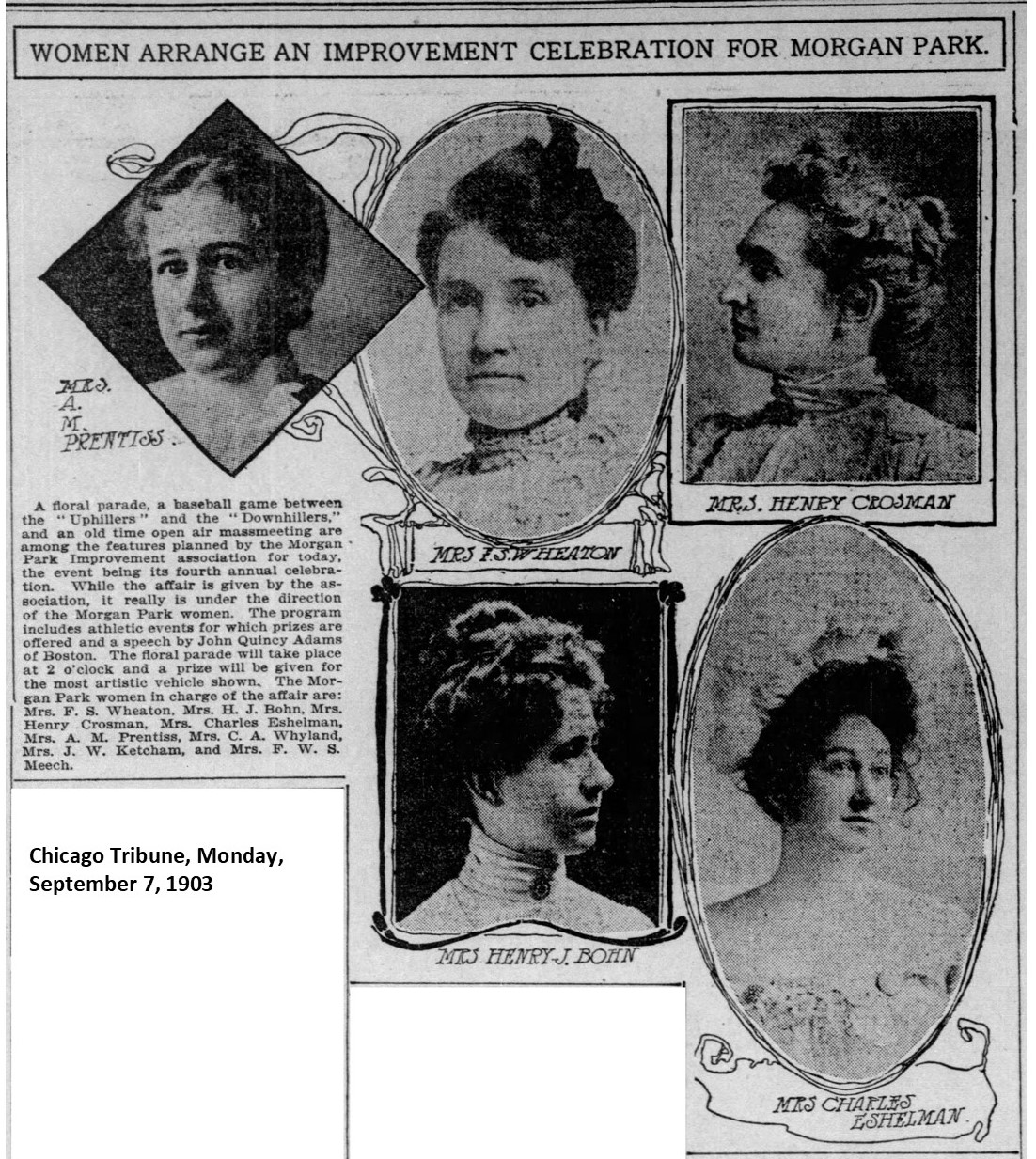 Although the day was attributed to the Morgan Park Improvement Association (MPIA), and chaired by prominent businessmen, it was readily acknowledged that the major part of the work was done by the Morgan Park Woman’s Club. The newspapers carried illustrations and pictures of the women who volunteered their time to make the day a success.