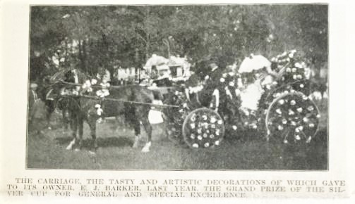The parade was the longest ever, stretching for two miles. For the first time, in addition to private carriages, police and fire department wagons, and floats entered by organizations, an invitation was extended to business and industry for floats, and for trade and farm wagons to enter. The Post described the entries as “tandems and singles, roadsters and gigs, autos and cowboys, horses and ponies, drug store floats and grocery store floats.”