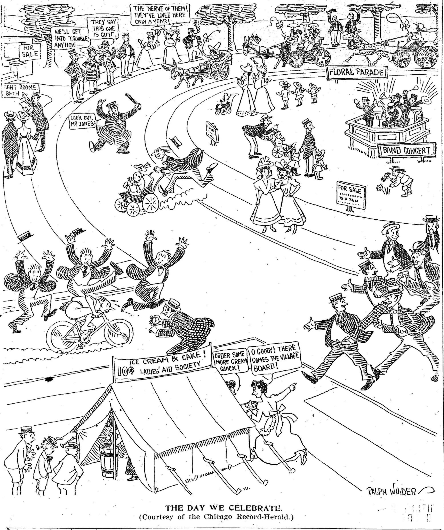 Ralph Wilder, a cartoonist for the Chicago Record-Herald newspaper who lived in the Village, served on the Morgan Park Day publicity committee. A cartoon he drew that captured the spirit of the day was reprinted in the Post. Wrote Herriott, “Ralph Wilder’s cartoon is not at all overdrawn. This is just how we all feel about it, regardless of who, which and what we are. It is our day – the people’s day – ‘of, for and by’ them, with nobody to say them nay.” The cartoon is included in the attachments.