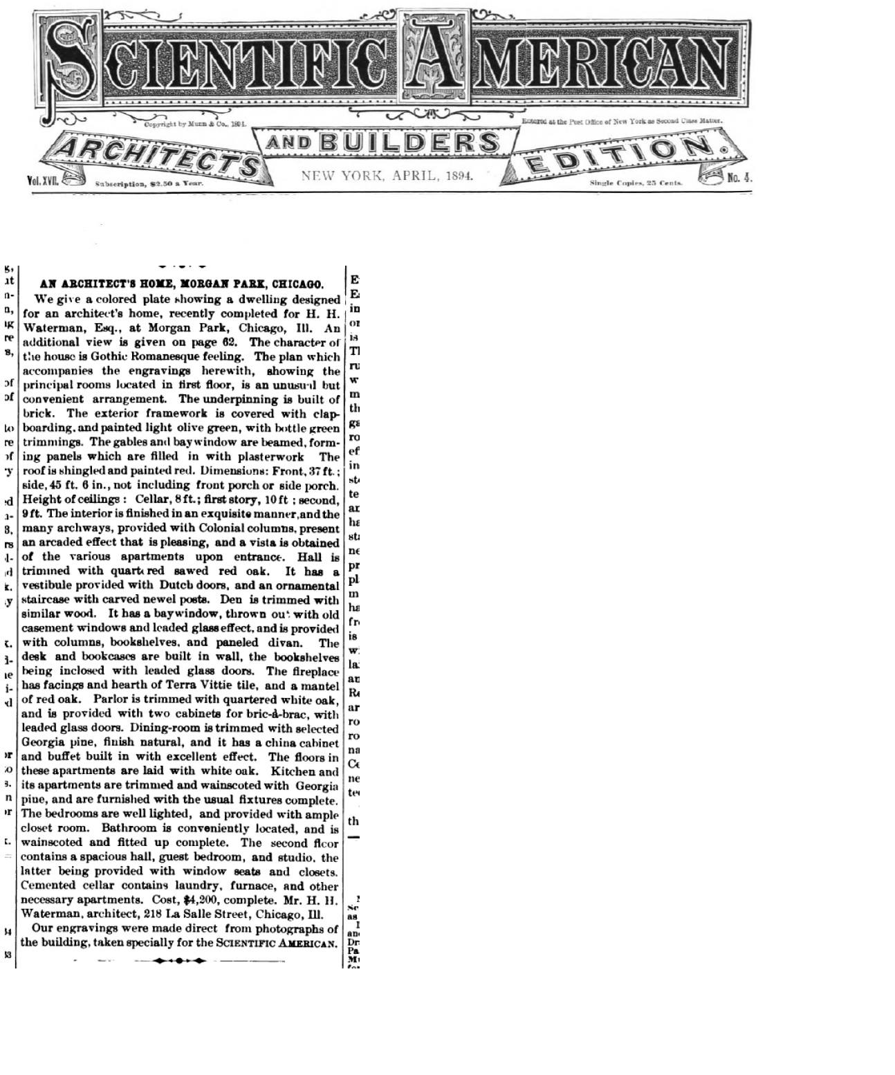 One of the most charming houses he designed was for himself and his first wife, Ida. This is the Harry Hale Waterman House at 10838 S. Longwood Drive, often referred to as the "Honeymoon Cottage." The house was built in 1893. Ida and H.H. were married in 1891, and they had one daughter, Waterman's only child, Louise. Ida died in 1896 at the age of 24. Waterman sold the cottage at that time.