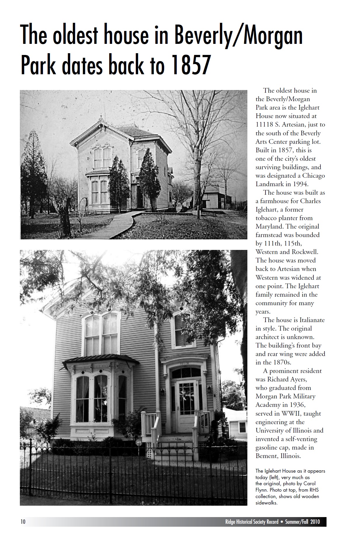 A: The Chambers House at 10330 S. Seeley Ave. was built in 1873, making it one of the oldest houses still standing. But the oldest house in the area on record is the Charles D. Iglehart House at 11118 S. Artesian Ave. Built in 1857, it is one of the oldest houses in Chicago. It originally was on Western Ave., surrounded by orchards, but was moved back when Western was graded and widened and paved. A photo of a newsletter article from RHS is attached.