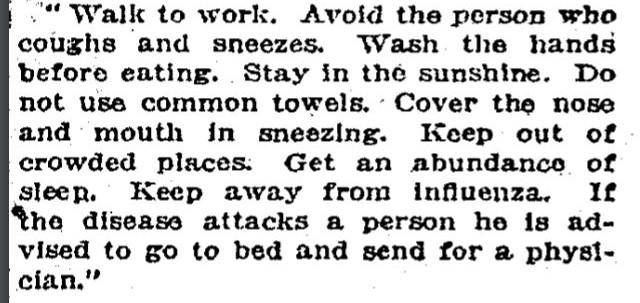 From Dr. W. A. Evans of the Chicago Daily Tribune: “Persons should avoid crowded assemblages, street cars and the like. Promiscuous coughing and spitting must not be tolerated. When a person comes down with the disease he should be cared for in well-ventilated, warm rooms as far as possible from other family members. The [disease] is spread by the nose and mouth secretions. These secretions are spread by coughing, spitting, sneezing, by the use of soiled handkerchiefs, towels, cups, spoons, and so forth. The folly of disregarding warnings [will be paid for].”