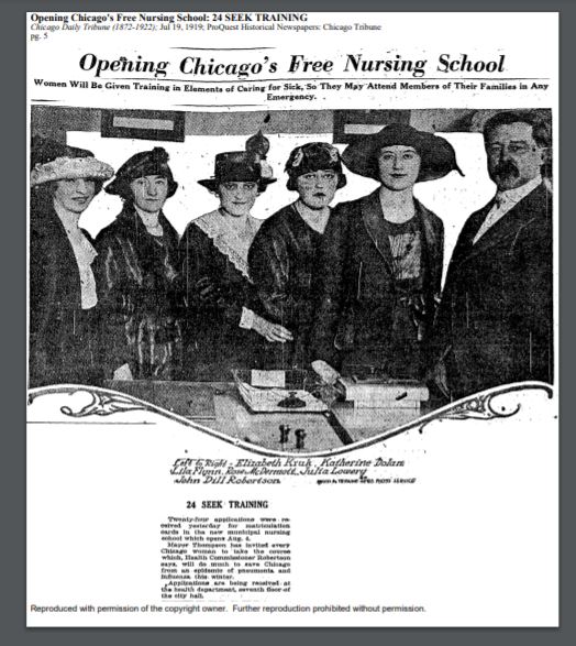 On January 12, the health commissioner, Dr. John Dill Robertson, authored an article in the Chicago Daily Tribune calling for an overhaul of the nursing profession. He stated that many of the influenza deaths could have been avoided with proper home nursing care, but there was a shortage of nurses. He maintained that the three years of training to become a Registered Nurse (R.N.) was too long, and that the $35 per week that R.N.s charged for home nursing care was more than could be afforded by middle class families.