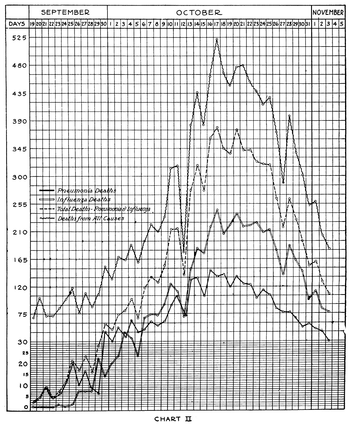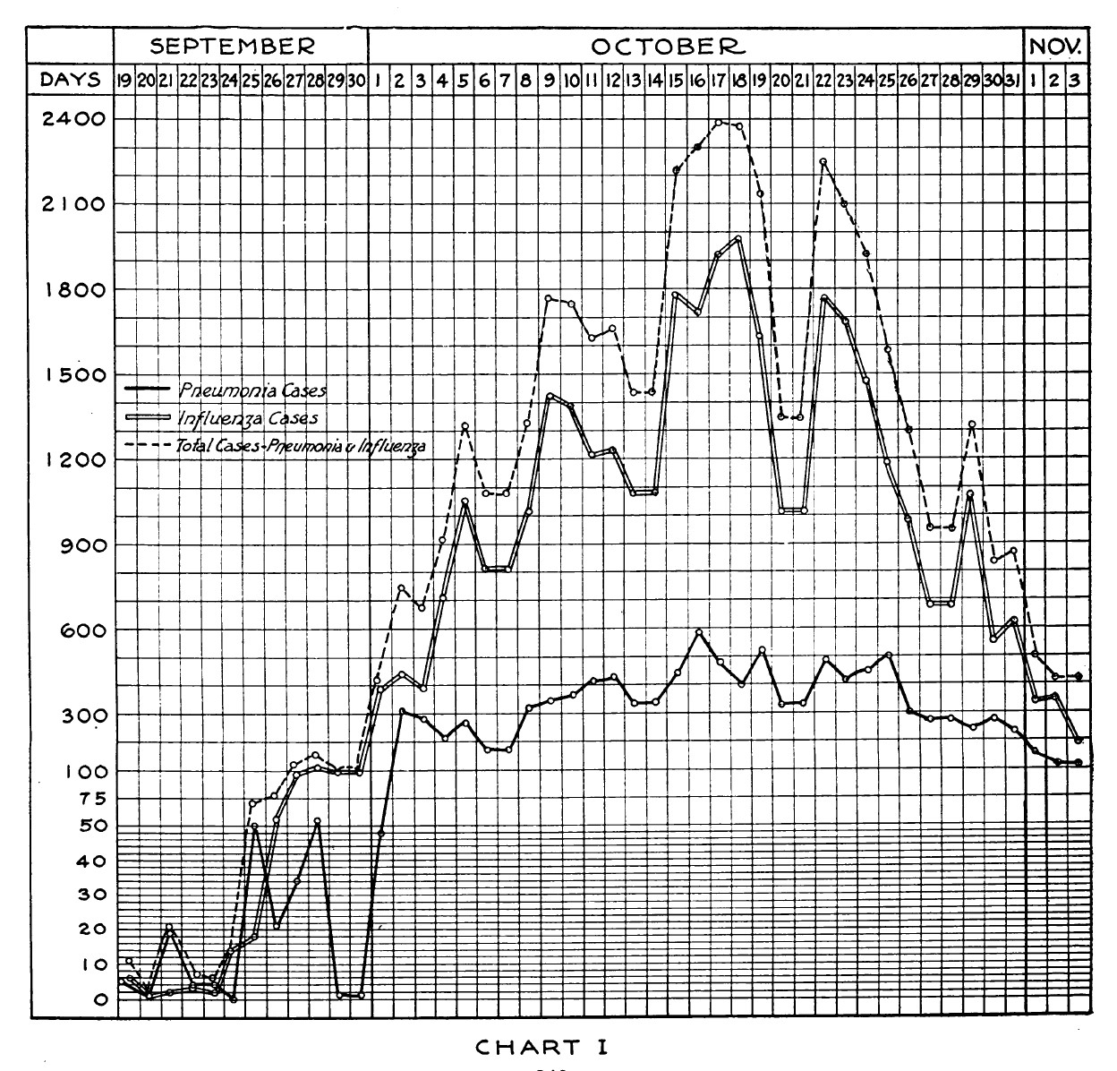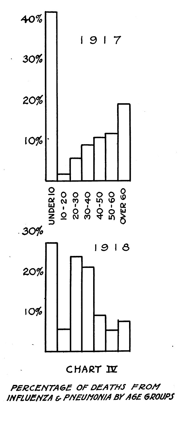 In this article, he gave statistics about the disease in graphical form for the month before, October 1918, which would prove to be the worse month for the outbreak. Three of those graphs are posted here.