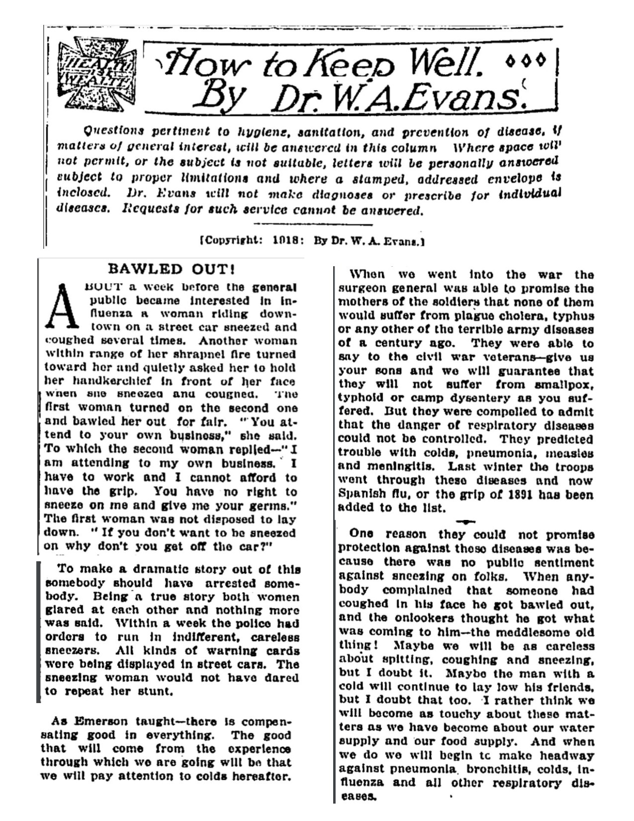 Sound familiar? Evans wrote these words about the Influenza pandemic in his Tribune column called “How to Keep Well” in the Fall of 1918.