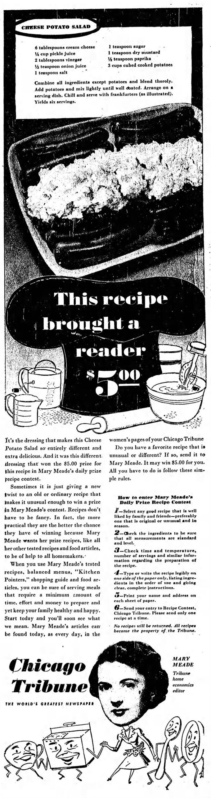 “Mary Meade” was the generic name the Tribune used for its woman food writers for years, because it was a common understanding, not only in the newspaper industry but in the workforce in general, that most women would not stay long in professional jobs but would marry and make home-keeping and raising families their careers.