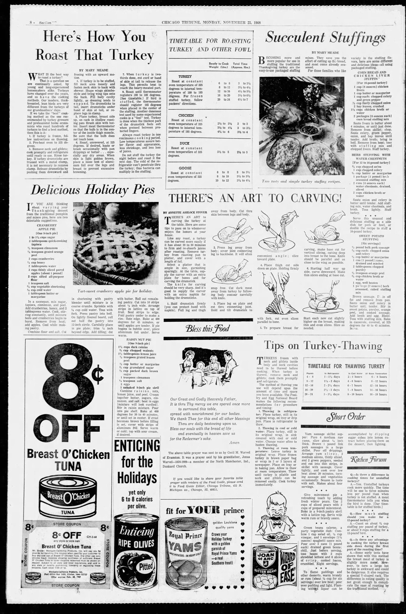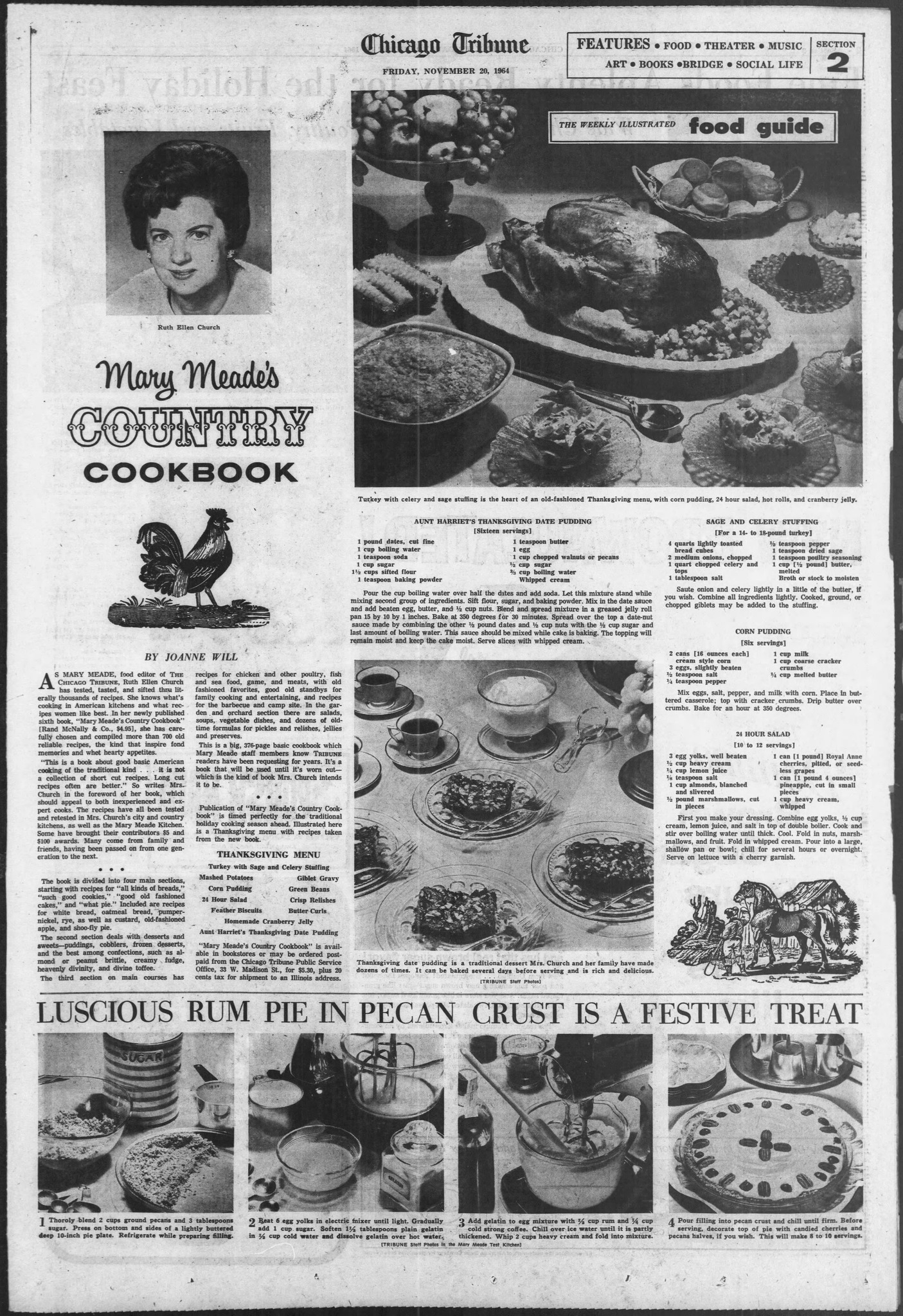 Anyone still deciding what to serve for Thanksgiving dinner need look no further than the Chicago Tribune food columns of fifty and more years ago. The food editor, Mary Meade, was none other than Beverly’s own Ruth Ellen Loverien Church, from 1937 until her retirement in 1974.