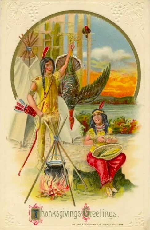Here is a vintage postcard recognizing the role of Native Americans in the first Thanksgiving.