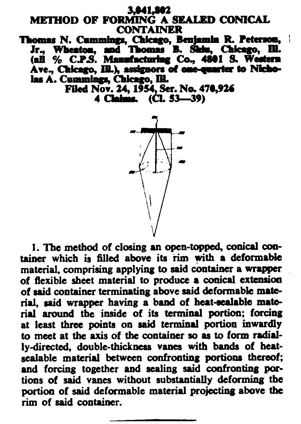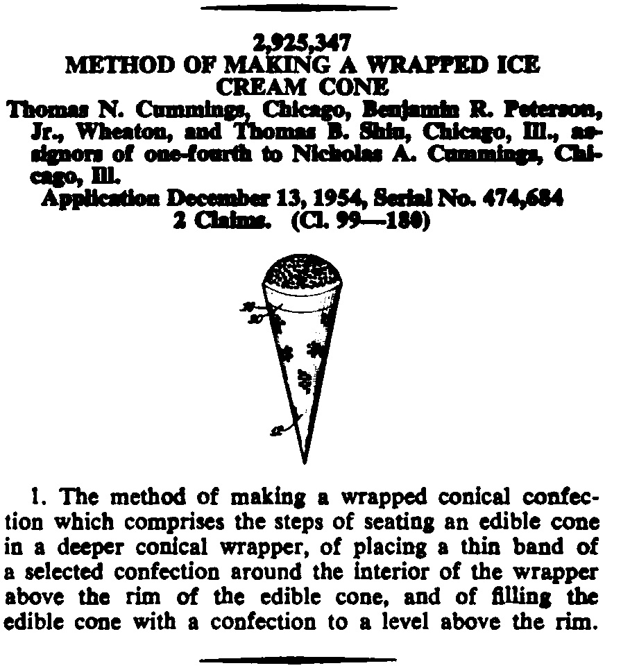 The patents were for a filling apparatus including injection valve, a method of making a wrapped ice cream cone, a method for forming a sealed conical container, and an apparatus for handling and filling erected cartons. Those patents are attachments to this post.