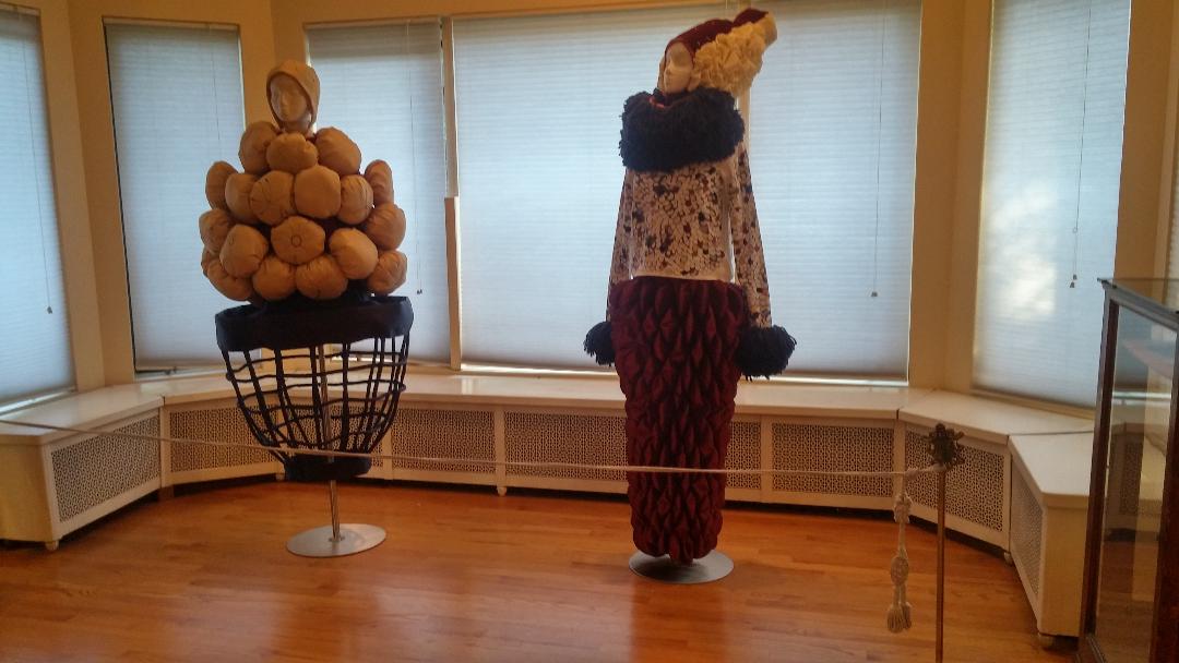 Sandra Leonard will loan us some of her sculptural clothing, costumes she has created for performance art and other events. Photos of her art in use and samples of her hand-painted fabrics will also be on display.