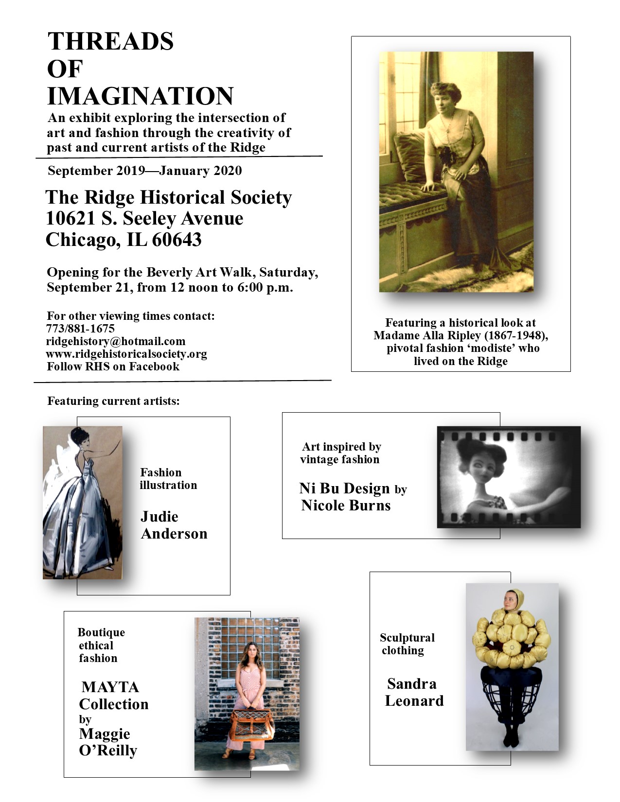Since the 1870s, when artists came by train from downtown Chicago to set up their easels for a day's sketching and painting, there has been an arts community on the Ridge. This exhibit looks at one of the most famous "modistes" of the Chicago, indeed the entire U.S.A., fashion scene, who made the Ridge her family's home.The quartet of current fashion artists who live and create on the Ridge contribute to keeping the arts community alive.