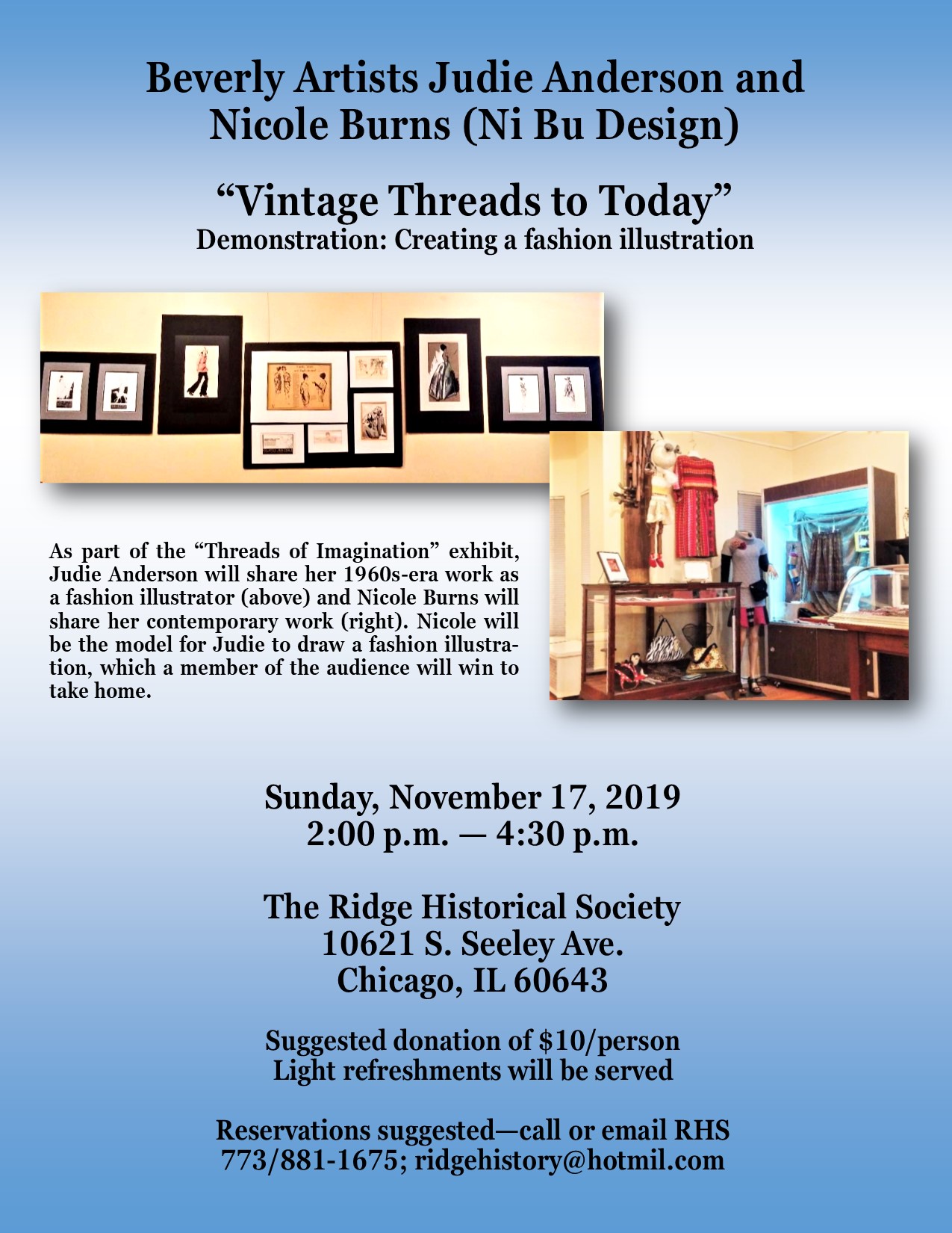 Nicole, wearing one of her creations, will then serve as model for Judie to draw a fashion illustration. A member of the audience will get to take home the drawing, after it is scanned for the historical record.