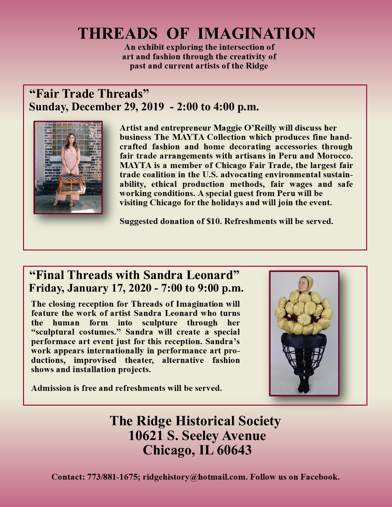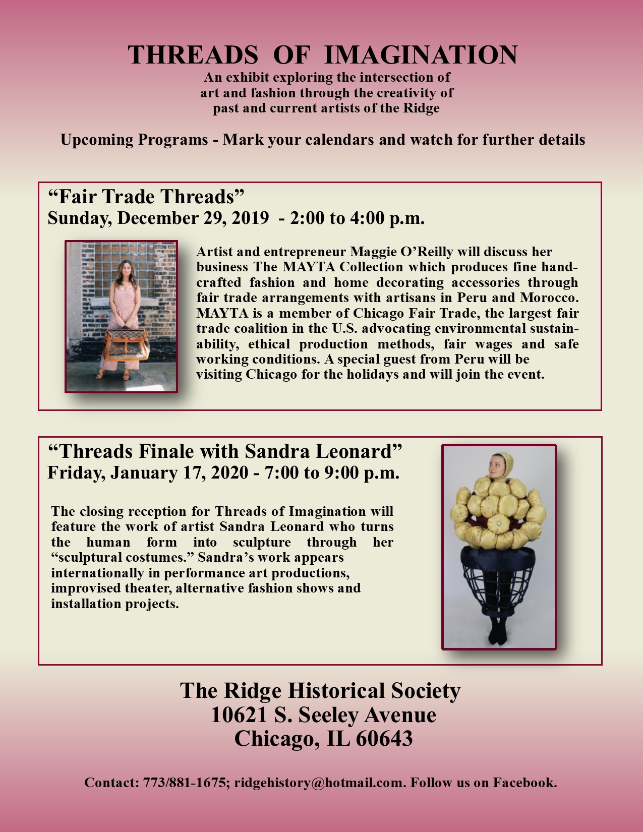 It’s been an incredible four months but they say all good things must come to an end. The closing reception for the “Threads of Imagination” exhibit at the Ridge Historical Society will be on Friday, January 17, 2020, from 7:00 to 9:00 p.m. at RHS, 10621 S. Seeley Ave., Chicago.
