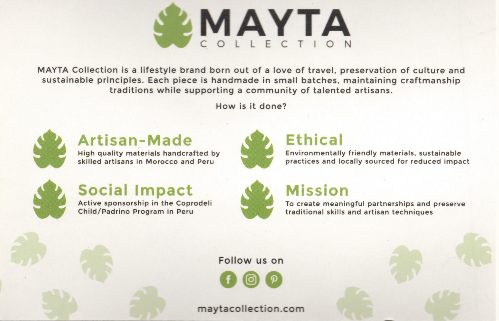 Maggie grew up in Beverly and she and her husband are now raising their own family here. Her business grew out of her love for travel and other cultures, particularly Latin cultures, and her love of fabrics, color and textures. The MAYTA Collection follows fair trade practices when dealing with the artisans of these other countries – fair wages, safe working conditions, contributions to their communities, and other ethical practices.