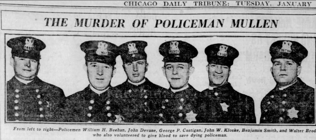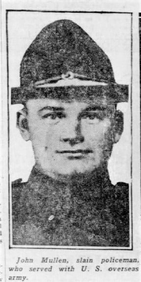 Mullen was 27 years old and still on probationary status, having joined the police force on November 11, less than two months before this fatal day. He was an honorably discharged veteran of World War I; he had served overseas with the U.S. Army Infantry. He lived with his parents at 1430 N. Clybourne Avenue. His father was Edward J. Mullen, a leader of the International Brotherhood of Teamsters. John Mullen left a fiancé, Violet Johnson.