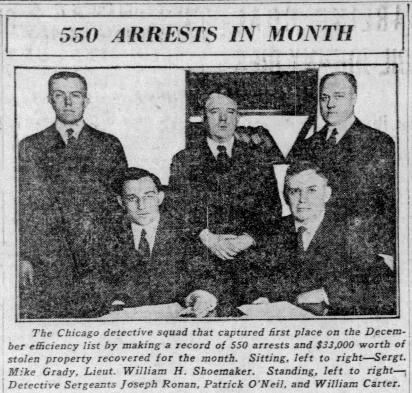 Morris might or might not have been aware that the detective unit that was hunting him had the best record in the city. On January 2, the unit, composed of Lt. Shoemaker, Det. Grady, who was acting as the bartender, and Det. Sgts. Ronan, O’Neill, and Carter, were the champs of the fifteen detective squads for December, with 550 arrests and the recovery of $33,000 in stolen property (about $438,000 today). They had rounded up a notorious band that had robbed a pharmacy and killed a police officer.