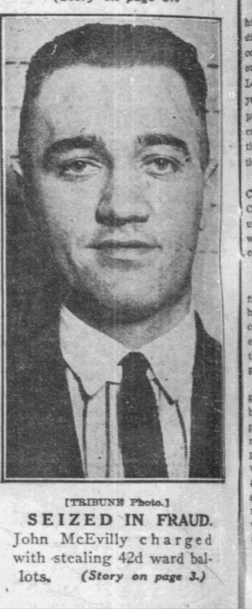 John McEvilly was still showing up in Chicago newspaper stories in 1949 at the age of 52. He was stabbed in the side and taken to the hospital but refused to identify his assailant. When the police investigated, his wife Shirley admitted she was the one who “accidentally” stabbed him. McEvilly was described as the “erstwhile hoodlum and political henchman” of Titus Haffa, an ex-alderman. McEvilly was frequently questioned by the police about jewelry robberies, and was accused of stealing ballot boxes and threatening the candidate running against Haffa in 1928, but he could not be positively identified.