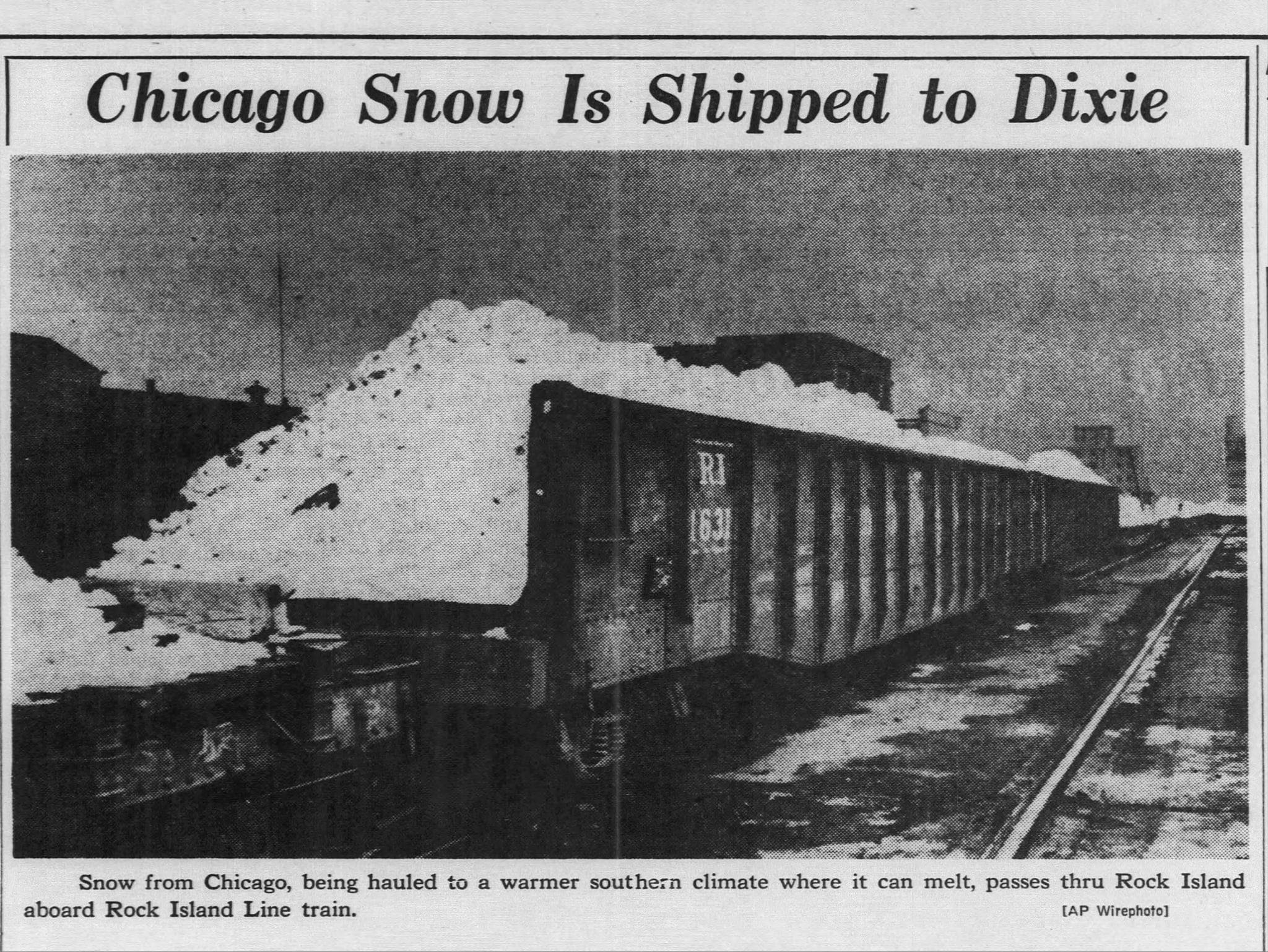 Chicago had so much snow, they actually loaded it onto railroad cars and sent it down south to melt. This photo is from the Chicago Tribune, February 11, 1967.