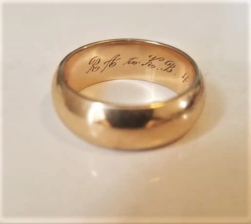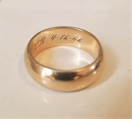 The ring belongs to Karen Berk Autenrieth, who married Robert Autenrieth on April 16, 1966. The inscription inside the ring reads “R.A. to K. B. 4-16-66.” It’s a beautiful ring – heavy gold, and in surprisingly good condition for being in the dirt for 50 years – a little scratched up, but not bad at all. Pictures of the ring and inscription are attached.