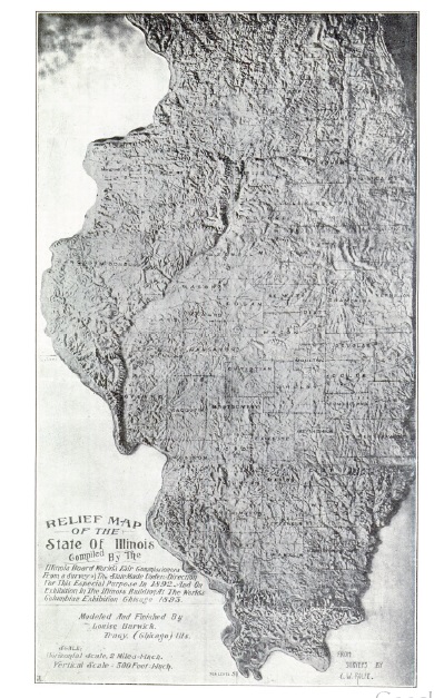 Louise Barwick’s work was one of the prize features of the Illinois building at the 1893 World’s Fair in Chicago, also known as the Columbian Exposition. She created and displayed a relief map of the State of Illinois, showing the topographical features of the state, such as the rivers, valleys, and geographic formations, as well as the counties, major cities, and railroads. The map was a huge 10 feet by 17 feet and made of plaster.