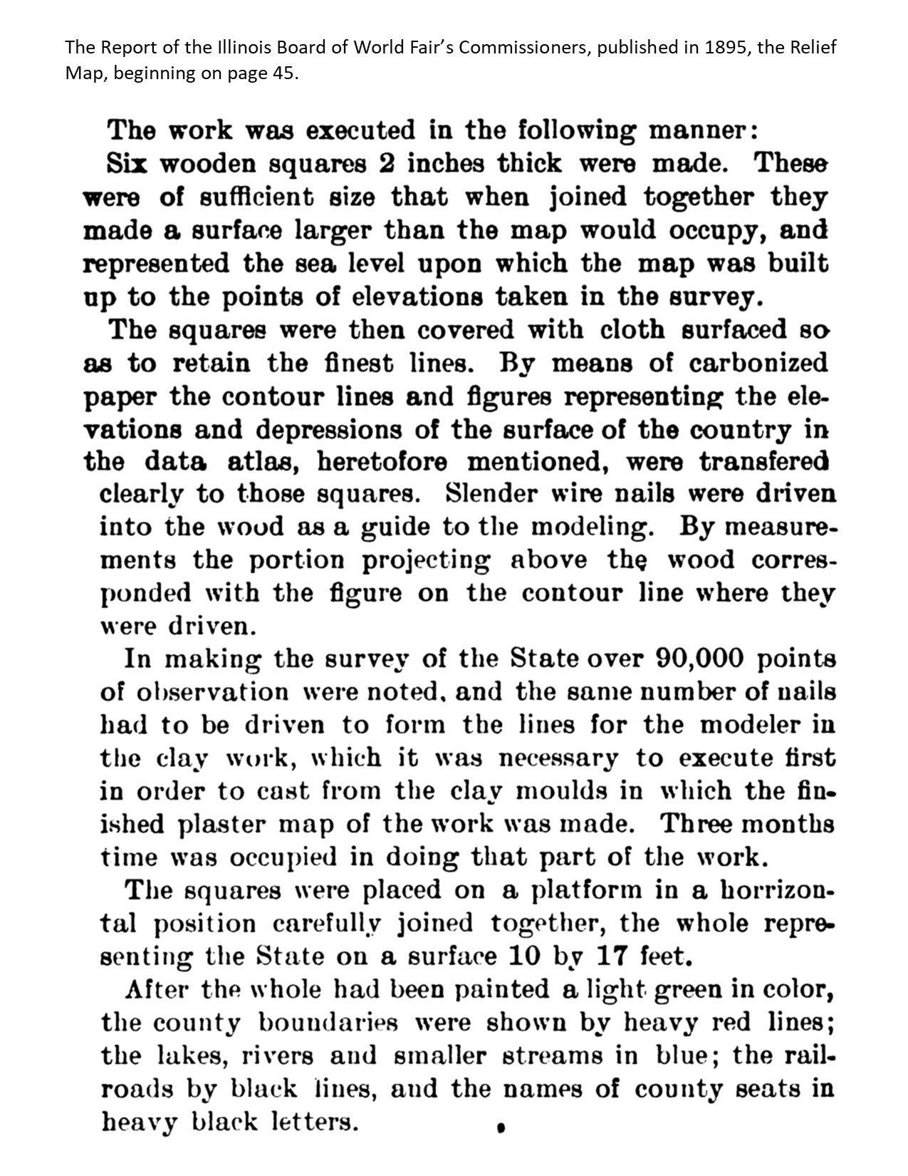 The Report of the Illinois Board of World Fair’s Commissioners, published in 1895, who proposed the map, covered the project in great detail. It was based on surveys overseen by C. W. Rolfe, professor of geology at the U. of Illinois – Urbana.