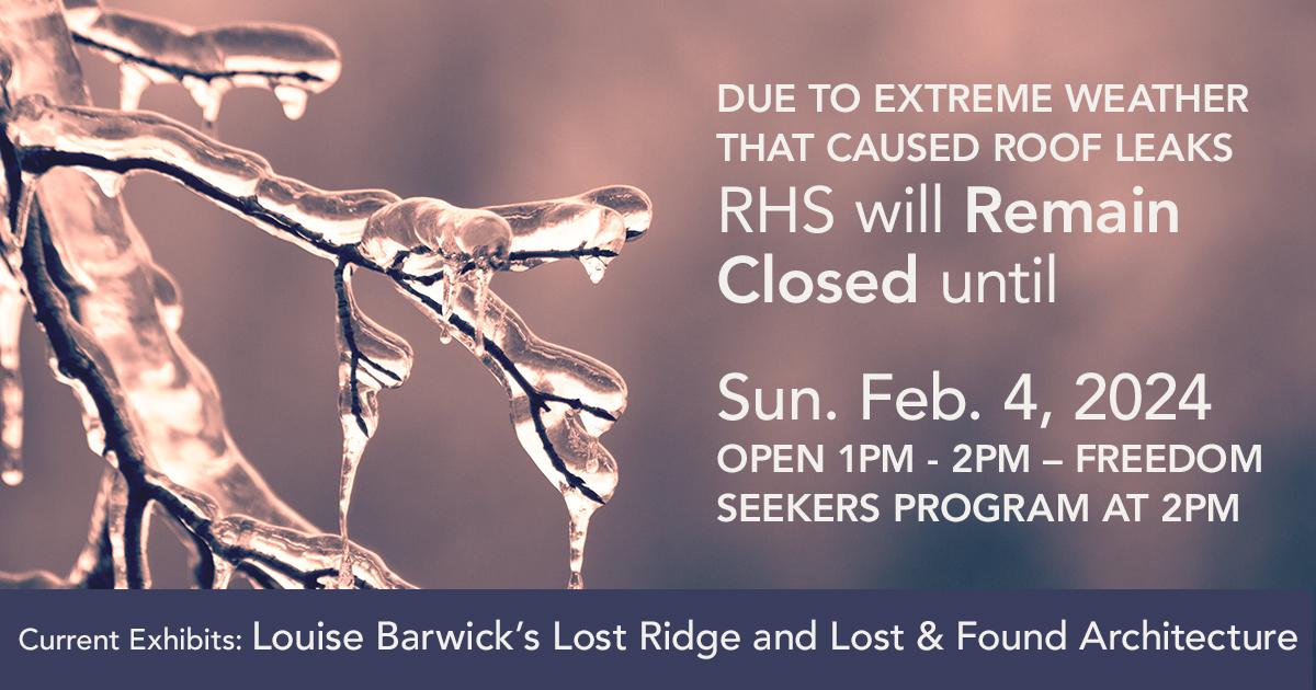 The Ridge Historical Society will be closed through February 4, 2024, due to a weather-related roof leak. Some damage occurred to the collection on the third floor. RHS is carefully examining the collection and drying, cleaning, and storing items properly.