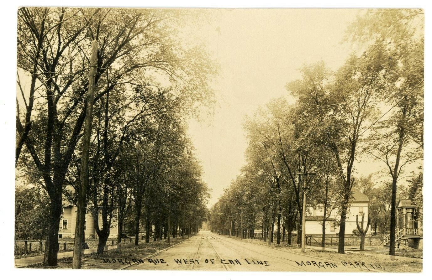 Morgan Avenue was the old name for 111th Street and Monterrey Ave. The picture of the stores would be just east of the Metra tracks, facing east. We're trying to place the other one. It could about where Morgan Park High School is now, facing west. The high school was built in 1914-16, so this would predate that. Actually, it predates Morgan Park's annexation to Chicago, which happened in 1914. Another option is that it could be west of Western Ave., heading toward the cemeteries.